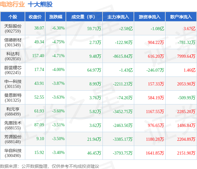 个股表现方面,电池行业当日领跌股为天际股份(002759),该股当日报收38.07,下跌6.3%,成交量59.71万,主力资金净流出2.58亿元。信德新材(301349)以下跌4.75%紧随其后,该股当日成交量2.73万,主力资金净流出122.9万元。除此之外,科达利(002850)、蔚蓝锂芯(002245)、中一科技(301150)均进入当日熊股之列。具体个股列表见下表: