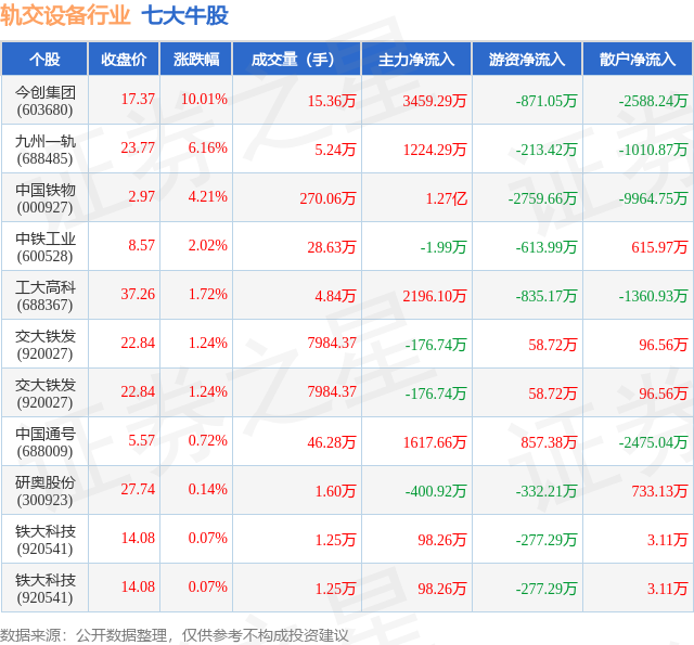 个股表现方面,轨交设备行业当日领涨股为今创集团(603680),该股当日报收17.37,上涨10.01%,成交量15.36万,主力资金净流入3459.29万元。九州一轨(688485)以上涨6.16%紧随其后,该股当日成交量5.24万,主力资金净流入1224.29万元。除此之外,中国铁物(000927)、中铁工业(600528)、工大高科(688367)均进入当日牛股之列。具体个股列表见下表: