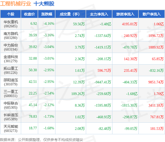 个股表现方面,工程机械行业当日领跌股为华东重机(002685),该股当日报收6.92,下跌4.16%,成交量59.56万,主力资金净流出1.48亿元。南方路机(603280)以下跌3.16%紧随其后,该股当日成交量2.74万,主力资金净流出1337.64万元。除此之外,中力股份(603194)、金道科技(301279)、拓山重工(001226)均进入当日熊股之列。具体个股列表见下表:
