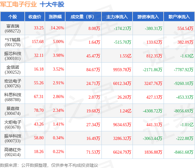 个股表现方面,军工电子行业当日领涨股为富吉瑞(688272),该股当日报收33.25,上涨14.26%,成交量8.08万,主力资金净流出174.23万元。*ST铖昌(001270)以上涨5.0%紧随其后,该股当日成交量1.64万,主力资金净流出515.7万元。除此之外,振芯科技(300101)、金信诺(300252)、宏达电子(300726)均进入当日牛股之列。具体个股列表见下表: