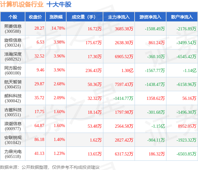 个股表现方面,计算机设备行业当日领涨股为熙菱信息(300588),该股当日报收28.27,上涨14.78%,成交量16.72万,主力资金净流入3685.38万元。旋极信息(300324)以上涨3.98%紧随其后,该股当日成交量175.67万,主力资金净流入2638.3万元。除此之外,浩瀚深度(688292)、同方股份(600100)、航天智装(300455)均进入当日牛股之列。具体个股列表见下表: