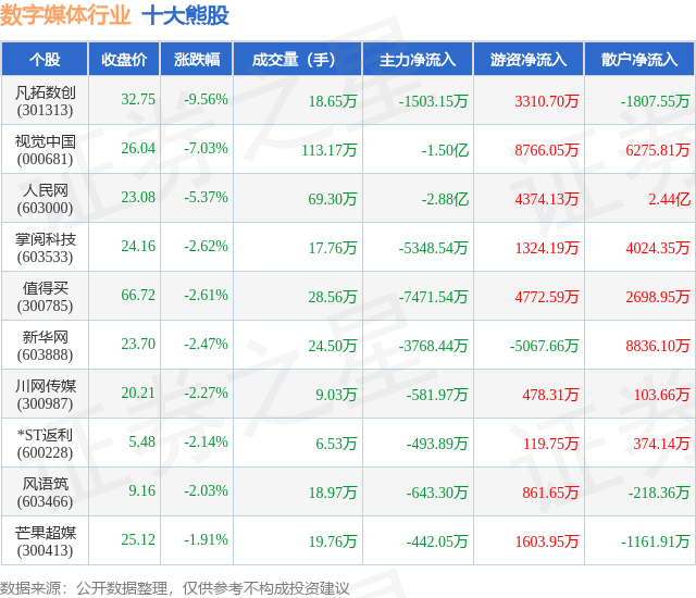 个股表现方面,数字媒体行业当日领跌股为凡拓数创(301313),该股当日报收32.75,下跌9.56%,成交量18.65万,主力资金净流出1503.15万元。视觉中国(000681)以下跌7.03%紧随其后,该股当日成交量113.17万,主力资金净流出1.5亿元。除此之外,人民网(603000)、掌阅科技(603533)、值得买(300785)均进入当日熊股之列。具体个股列表见下表: