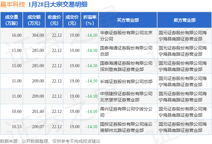 证券之星消息,1月28日晨丰科技发生大宗交易,交易数据如下: