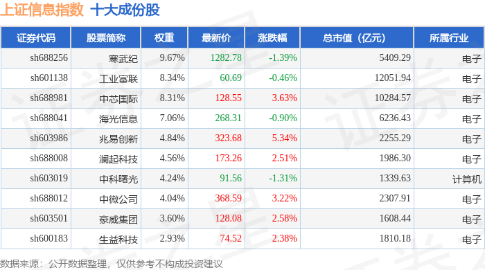 证券之星消息,1月28日,上证信息(000039)指数报收于6300.16点,涨0.7%,成交1639.07亿元,换手率2.83%。当日该指数成份股中,上涨的有21家,士兰微以6.18%的涨幅领涨,下跌的有29家,盛科通信以5.46%的跌幅领跌。