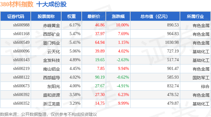 380材料(000105)指数十大成份股详情如下: