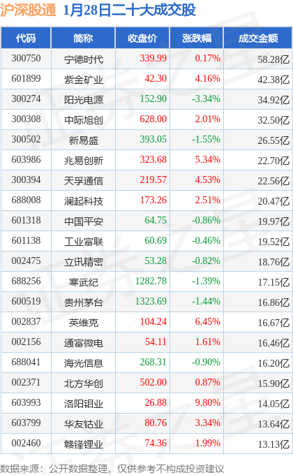 当日北向资金余额额度充足,盈新发展(000620)领涨,涨幅10.06%,交易所公布的沪深股通二十大成交股中成交额前三的为宁德时代、紫金矿业、阳光电源,成交额分别为58.28亿元、42.38亿元、34.92亿元。详情可见下表: