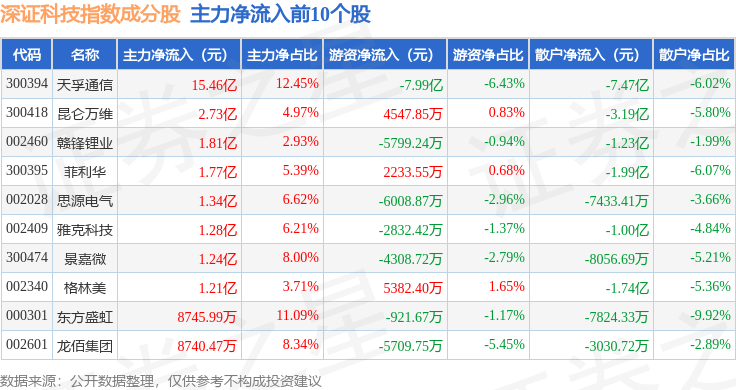 资金流向方面,深证科技(399339)指数成份股当日主力资金净流出合计107.4亿元,游资资金净流入合计2.3亿元,散户资金净流入合计105.11亿元。成份股资金流向详情见下表: