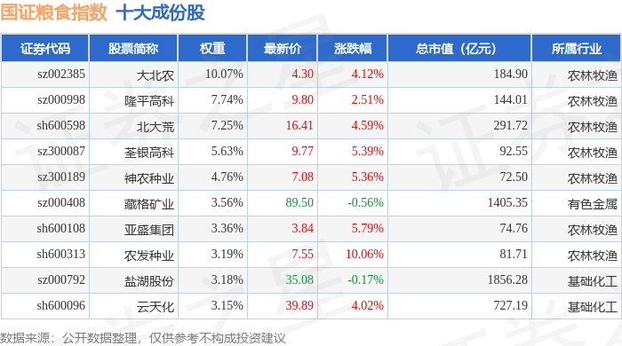 国证粮食(399365)指数十大成份股详情如下: