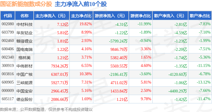 资金流向方面,国证新能(399412)指数成份股当日主力资金净流出合计76.89亿元,游资资金净流入合计18.19亿元,散户资金净流入合计58.7亿元。成份股资金流向详情见下表: