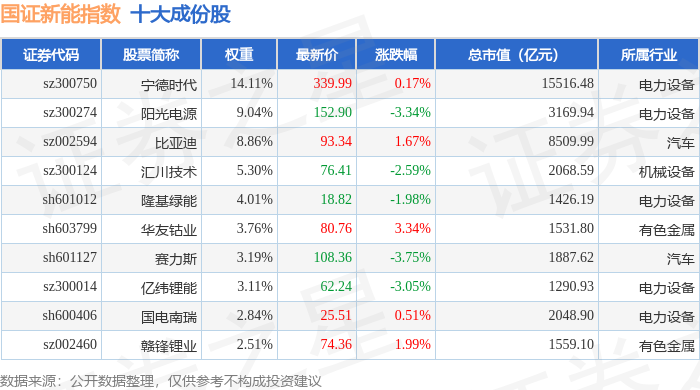 国证新能(399412)指数十大成份股详情如下: