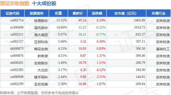 国证农牧(399435)指数十大成份股详情如下: