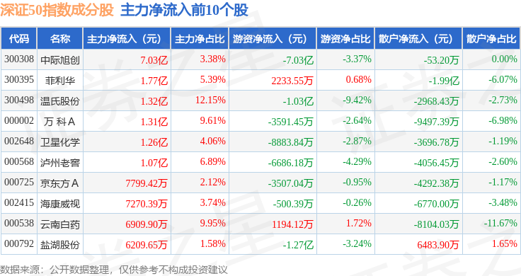 资金流向方面,深证50(399850)指数成份股当日主力资金净流出合计67.77亿元,游资资金净流出合计9.91亿元,散户资金净流入合计77.68亿元。成份股资金流向详情见下表: