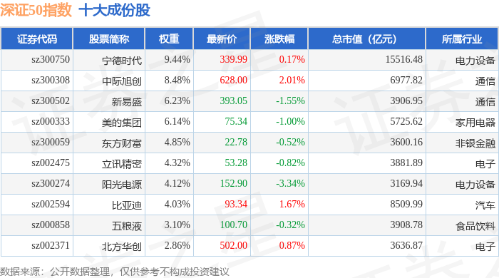 深证50(399850)指数十大成份股详情如下:
