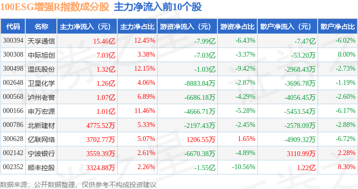 资金流向方面,100ESG增强R(470033)指数成份股当日主力资金净流出合计60.02亿元,游资资金净流出合计13.56亿元,散户资金净流入合计73.58亿元。成份股资金流向详情见下表: