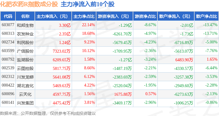 资金流向方面,化肥农药R(480035)指数成份股当日主力资金净流入合计8.8亿元,游资资金净流出合计6.36亿元,散户资金净流出合计2.32亿元。成份股资金流向详情见下表: