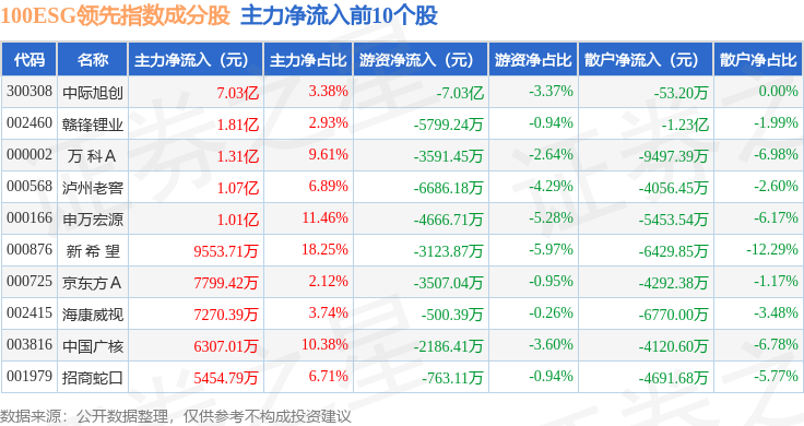 资金流向方面,100ESG领先(970030)指数成份股当日主力资金净流出合计72.31亿元,游资资金净流出合计6.41亿元,散户资金净流入合计78.71亿元。成份股资金流向详情见下表: