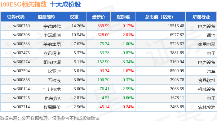100ESG领先(970030)指数十大成份股详情如下:
