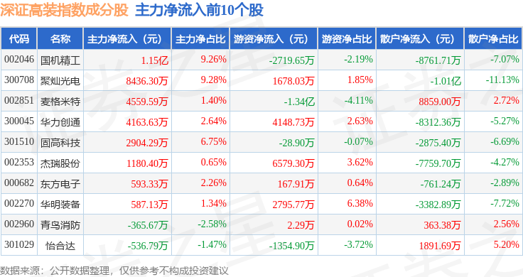 资金流向方面,深证高装(970037)指数成份股当日主力资金净流出合计32.57亿元,游资资金净流入合计7.45亿元,散户资金净流入合计25.11亿元。成份股资金流向详情见下表: