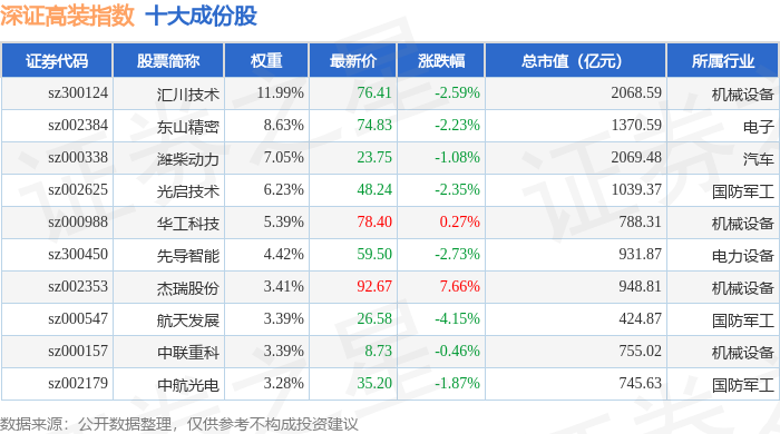 深证高装(970037)指数十大成份股详情如下: