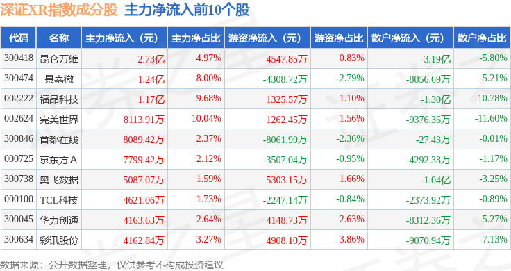 资金流向方面,深证XR(970046)指数成份股当日主力资金净流出合计40.12亿元,游资资金净流入合计10.42亿元,散户资金净流入合计29.69亿元。成份股资金流向详情见下表: