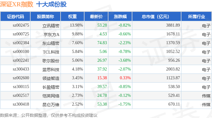 深证XR(970046)指数十大成份股详情如下: