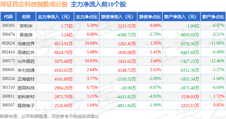 资金流向方面,深证民企科技(970059)指数成份股当日主力资金净流出合计63.16亿元,游资资金净流入合计5.66亿元,散户资金净流入合计57.49亿元。成份股资金流向详情见下表: