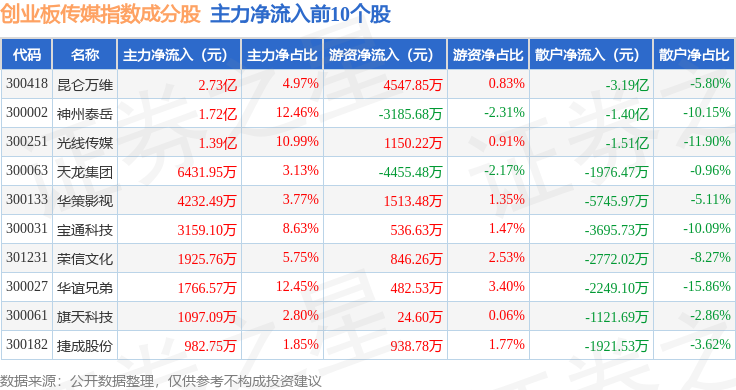 资金流向方面,创业板传媒(970084)指数成份股当日主力资金净流出合计26.55亿元,游资资金净流入合计7.78亿元,散户资金净流入合计18.77亿元。成份股资金流向详情见下表: