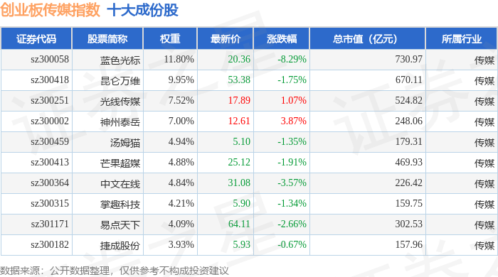 证券之星消息,1月28日,创业板传媒(970084)指数报收于1661.97点,跌2.35%,成交494.99亿元,换手率7.72%。当日该指数成份股中,上涨的有9家,神州泰岳以3.87%的涨幅领涨,下跌的有32家,蓝色光标以8.29%的跌幅领跌。