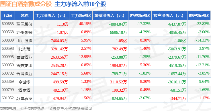 资金流向方面,国证白酒(980031)指数成份股当日主力资金净流出合计11.38亿元,游资资金净流入合计13.63亿元,散户资金净流出合计2.25亿元。成份股资金流向详情见下表: