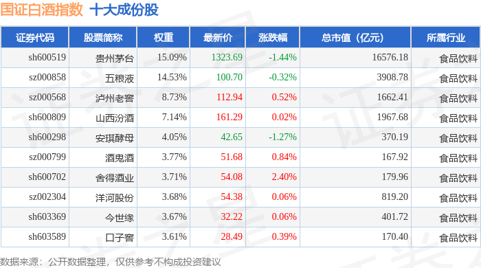 证券之星消息,1月28日,国证白酒(980031)指数报收于61434.47点,涨0.6%,成交227.94亿元,换手率1.57%。当日该指数成份股中,上涨的有21家,豫园股份以10.02%的涨幅领涨,下跌的有5家,广誉远以2.35%的跌幅领跌。