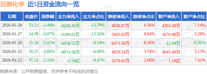 证券之星消息,截至2026年1月28日收盘,百傲化学(603360)报收于33.23元,下跌2.49%,换手率2.62%,成交量18.48万手,成交额6.15亿元。