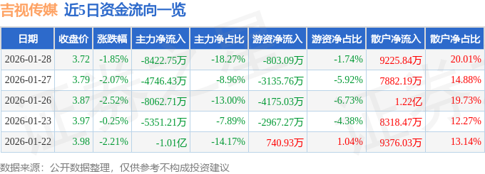 证券之星消息,截至2026年1月28日收盘,吉视传媒(601929)报收于3.72元,下跌1.85%,换手率3.52%,成交量122.95万手,成交额4.61亿元。