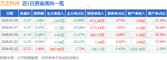 证券之星消息,截至2026年1月28日收盘,方正科技(600601)报收于11.67元,下跌1.68%,换手率2.9%,成交量120.73万手,成交额14.16亿元。