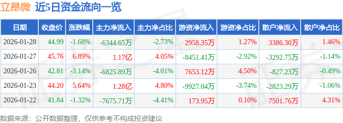 证券之星消息,截至2026年1月28日收盘,立昂微(605358)报收于44.99元,下跌1.68%,换手率7.62%,成交量51.16万手,成交额23.23亿元。