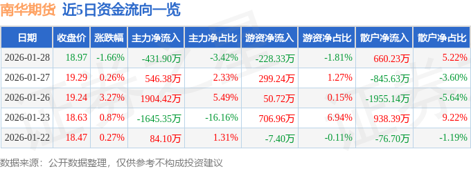 证券之星消息,截至2026年1月28日收盘,南华期货(603093)报收于18.97元,下跌1.66%,换手率1.08%,成交量6.59万手,成交额1.26亿元。