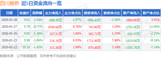 证券之星消息,截至2026年1月28日收盘,四川路桥(600039)报收于9.62元,下跌1.64%,换手率0.55%,成交量47.6万手,成交额4.62亿元。