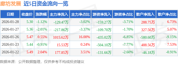 证券之星消息,截至2026年1月28日收盘,廊坊发展(600149)报收于5.3元,下跌1.12%,换手率2.13%,成交量8.08万手,成交额4292.76万元。