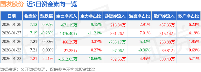 证券之星消息,截至2026年1月28日收盘,国发股份(600538)报收于7.12元,下跌0.97%,换手率1.96%,成交量10.26万手,成交额7337.22万元。