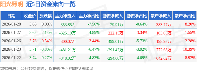 证券之星消息,截至2026年1月28日收盘,阳光照明(600261)报收于3.65元,上涨0.0%,换手率0.96%,成交量12.8万手,成交额4678.09万元。