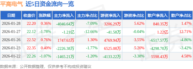 证券之星消息,截至2026年1月28日收盘,平高电气(600312)报收于22.2元,上涨0.36%,换手率1.9%,成交量25.78万手,成交额5.71亿元。