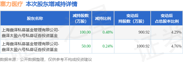 证券之星消息,1月28日塞力医疗发布公告《塞力医疗:关于持股5%以上股东减持股份结果公告》,其股东上海盎泽私募基金管理有限公司-盎泽太盈六号私募证券投资基金于2025年12月12日至2026年1月28日间合计减持150.0万股,占公司目前总股本的0.7137%,变动期间该股股价上涨12.4%,截止1月28日收盘报23.29元。