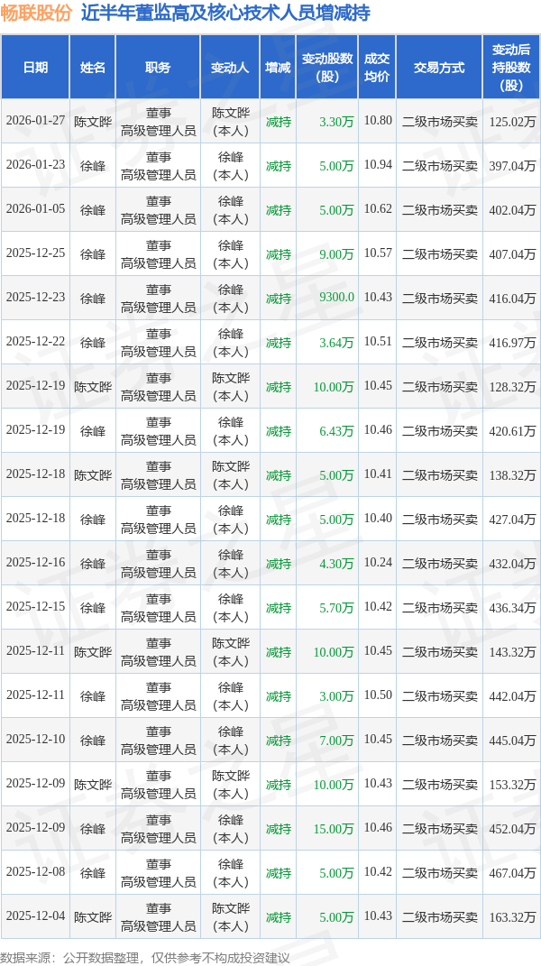 畅联股份近半年内的董监高及核心技术人员增减持详情如下: