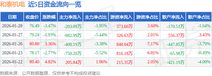 证券之星消息,截至2026年1月28日收盘,和泰机电(001225)报收于76.49元,下跌3.47%,换手率6.44%,成交量1.36万手,成交额1.04亿元。