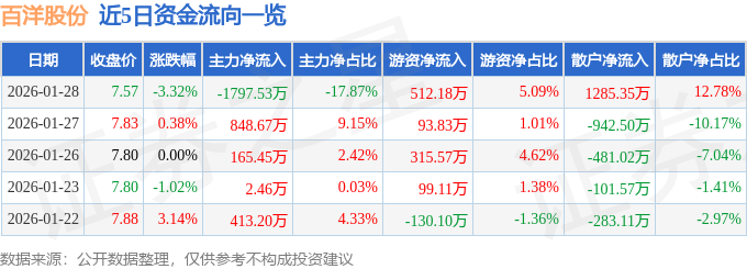 证券之星消息,截至2026年1月28日收盘,百洋股份(002696)报收于7.57元,下跌3.32%,换手率3.92%,成交量13.12万手,成交额1.01亿元。