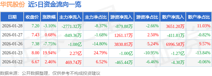 证券之星消息,截至2026年1月28日收盘,华民股份(300345)报收于7.2元,下跌3.1%,换手率9.45%,成交量45.29万手,成交额3.31亿元。