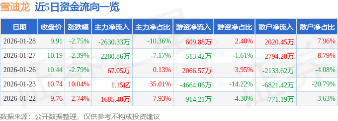 证券之星消息,截至2026年1月28日收盘,雪迪龙(002658)报收于9.91元,下跌2.75%,换手率7.11%,成交量25.49万手,成交额2.54亿元。