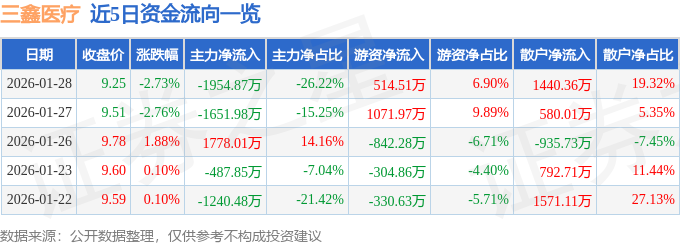 证券之星消息,截至2026年1月28日收盘,三鑫医疗(300453)报收于9.25元,下跌2.73%,换手率2.23%,成交量8.02万手,成交额7455.3万元。