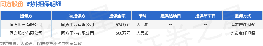 同方股份1月27日披露2笔对外担保,被担保方为同方工业有限公司。对外担保明细如下表: