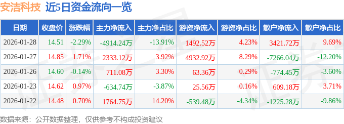 证券之星消息,截至2026年1月28日收盘,安洁科技(002635)报收于14.51元,下跌2.29%,换手率6.09%,成交量24.07万手,成交额3.53亿元。