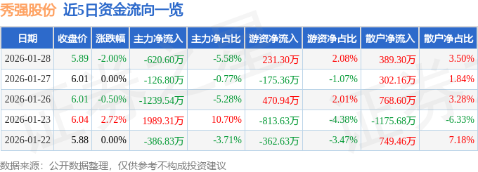 证券之星消息,截至2026年1月28日收盘,秀强股份(300160)报收于5.89元,下跌2.0%,换手率2.45%,成交量18.72万手,成交额1.11亿元。